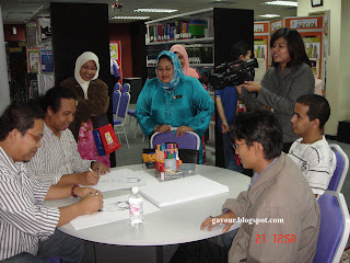 Tugas kitorang kat sini ialah melukis karikatur pengujung yang datang sebagai salah satu aktiviti yang disediakan buat pengunjung yang datang. Sedang syok lukis, Pengarah NIEW Puan Fadzilah Mohd Saaid datang menjenguk kitorang. Tu yang bebaju biru tu la pengarah kat sini. Perpustakaan ni tidak dinamakan perpustakaan tapi dinamakan NIEW singkatan dari NAM Institute for the Empowerment of Women. Bebelit lidah menyebutnya. Bukan lidah gua jer bebelit, para librarian dan PRO NIEW pun penat dan bebelit lidah memberitahu kitorang. Kesian… nasib korang la! Harharhar!